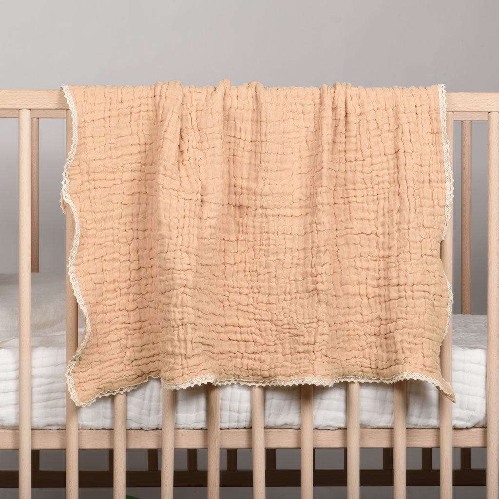 Cette couverture certifiées OEKO-TEX est fait de 6 épaisseurs de mousseline de coton se qui la rend moelleuse mais elle conserve la propriété respirant de la mousseline. Une délicate bande de dentelle de coton couleur écru est présente sur les 4 côtés.