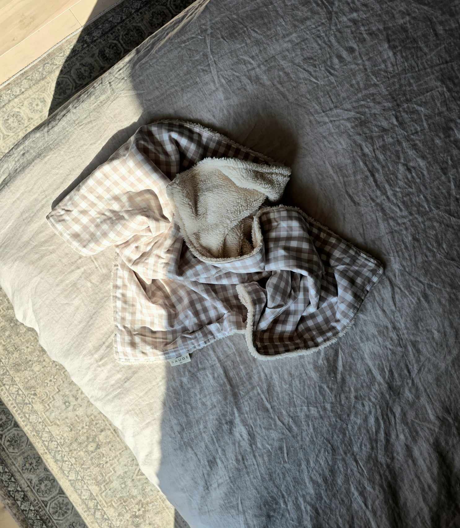 * Puisque cette couverture est faite de 2 tissus à composition différente il se peut qu’elle se déforme un peu au lavage. Laver à l'eau froide à cycle délicat et suspendre pour sécher.  Ne pas utiliser de javellisant, ne pas utiliser de chaleur sur le côté Minky (Sherpa).