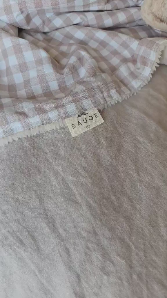 Cette magnifique couverture doublée d’un Minky style Sherpa extrêmement doux vous charmera au premier toucher. La couverture gardera au chaud votre bébé dans son cocon moelleux lors des siestes ou des promenades. Durant les jours plus chauds, utiliser du côté tissus pour garder la fraicheur tout en ayant l’effet moelleux du Sherpa.