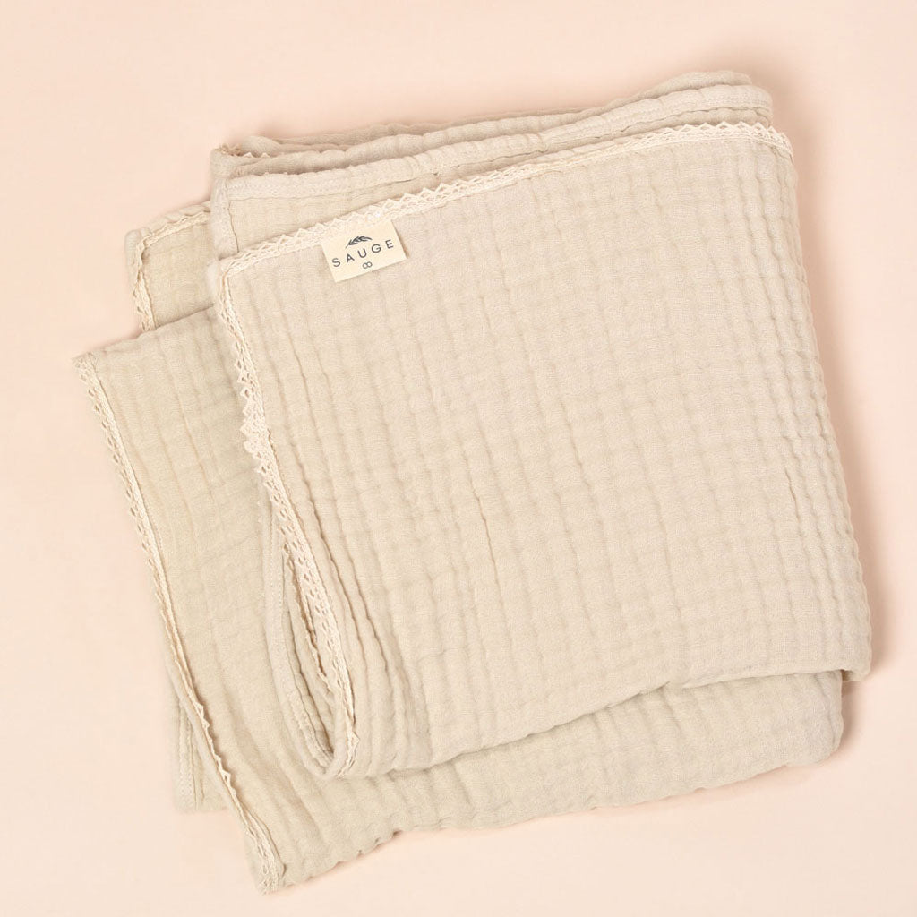 Une délicate dentelle de coton couleur écru borde les quatre côtés, ajoutant une touche élégante et intemporelle.